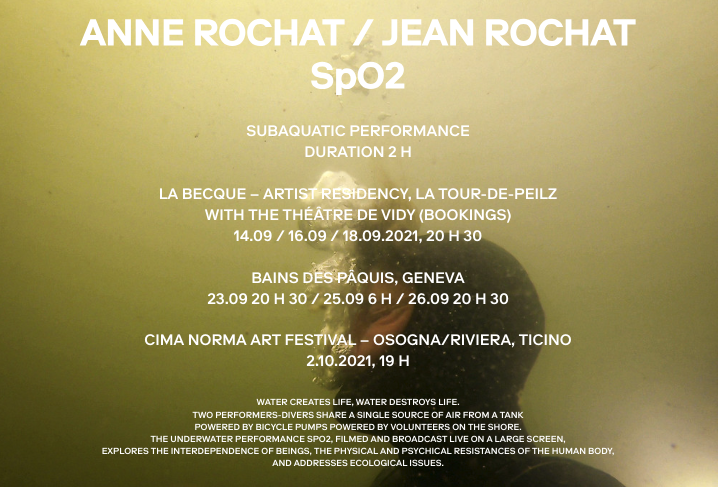 SpO2 was created in 2021 on two sites, on the shores of Lake Geneva, then in a river in Ticino. For each context, a specific partnership is set up by the artists and by Arta Sperto. At La Tour-de-Peilz, with La Becque – Artist Residencies in collaboration with the Théâtre de Vidy. In Geneva, with the Bains des Pâquis and in Ticino, with the Cima Norma Art Festival. This first trajectory, neither live performance tour nor travelling exhibition, invents a model of artistic aquatic cartography.
