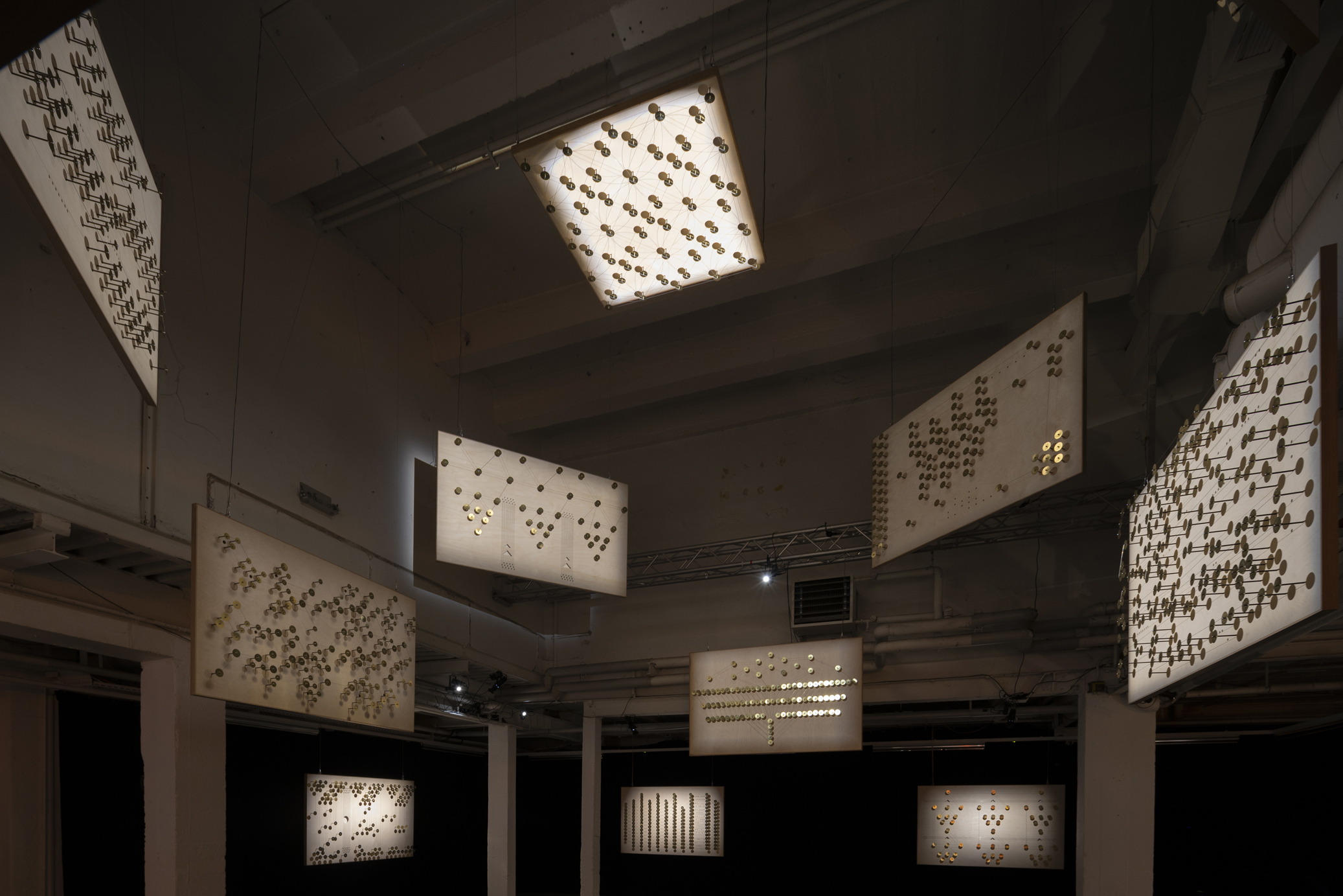 Multiverse of a Birdcage est un projet d’Alexandre Joly, qui a réalisé les panneaux haut-parleurs, et Daniel Zea, qui a conçu l’interface de diffusion sonore. L’installation est composée de 17 panneaux haut-parleurs suspendus dans l’espace, formant un système de diffusion à 17 voix. Cet acousmonium hybride contient environ 1’500 piezos, ces petites pastilles qui vibrent lorsqu’elles reçoivent un signal. Fixées à l’aide d’aimants sur des tiges en acier et reliées entre elles par des fils de cuivre et des cordes à piano, ces connexions apparentes dessinent des compositions graphiques et rappellent l’imagerie d’une lutherie expérimentale. Ces instruments de diffusion colorent les sons avec de subtiles réverbérations qui se révèlent à travers leurs mouvements dans l’espace. À la manière d’un salon d’écoute, Multiverse of a Birdcage invite à l’exploration de multiples univers sonores. Cet instrument collectif diffuse un répertoire de pièces sonores (actuellement 41) qui s’enrichit à chacune de ses présentations. Joly et Zea proposent à des artistes de mettre à disposition des pièces sonores qui sont diffusée par le dispositif.