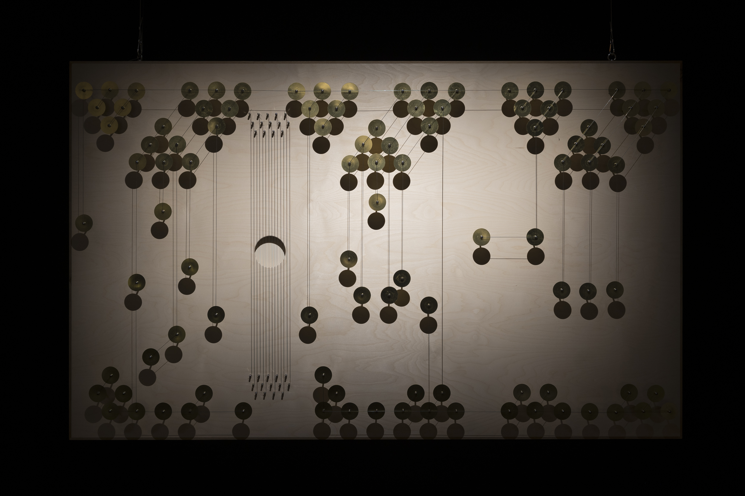 2020–2025, installation électro-acoustique (piezos, cordes de piano, fils de cuivre et panneaux de bois)