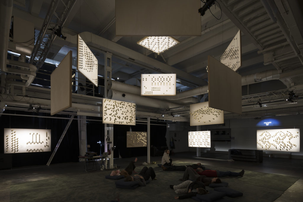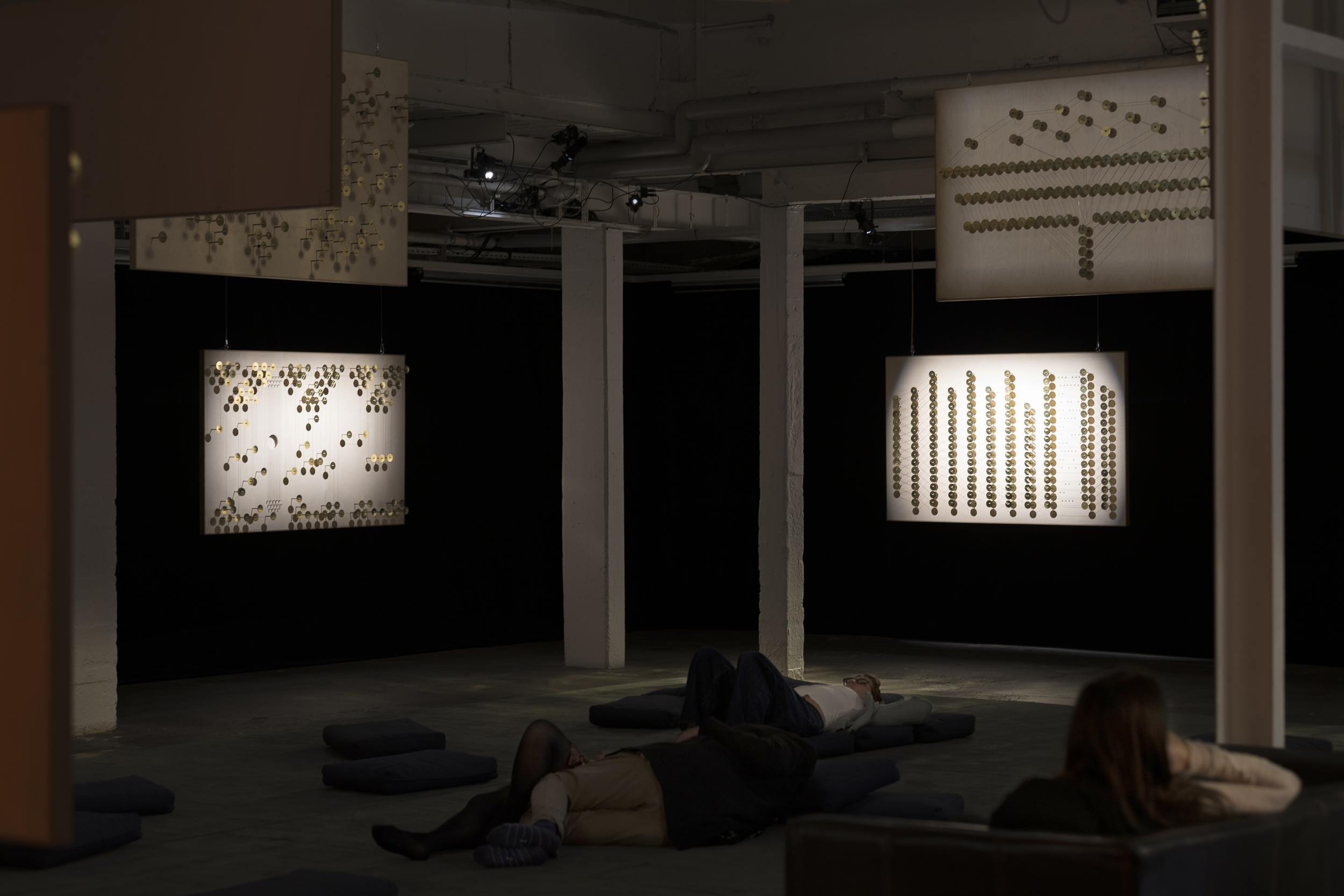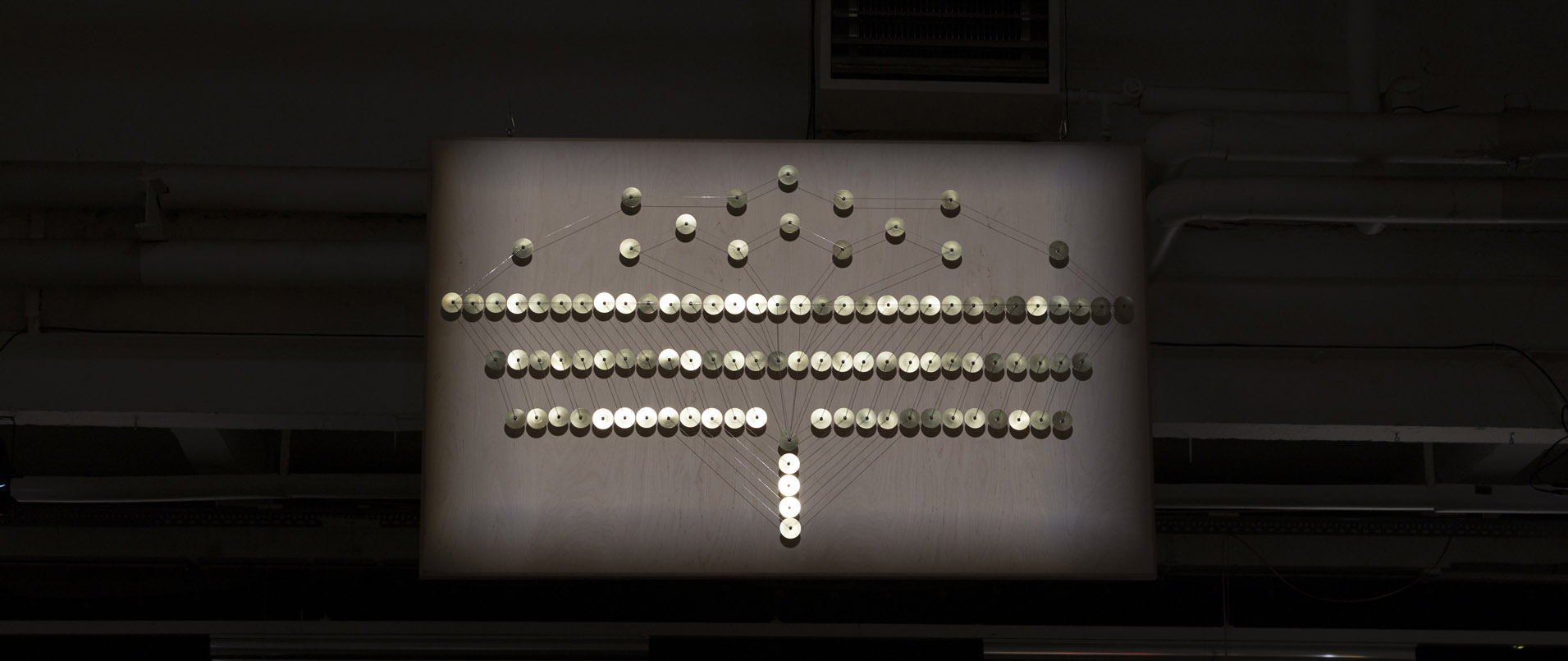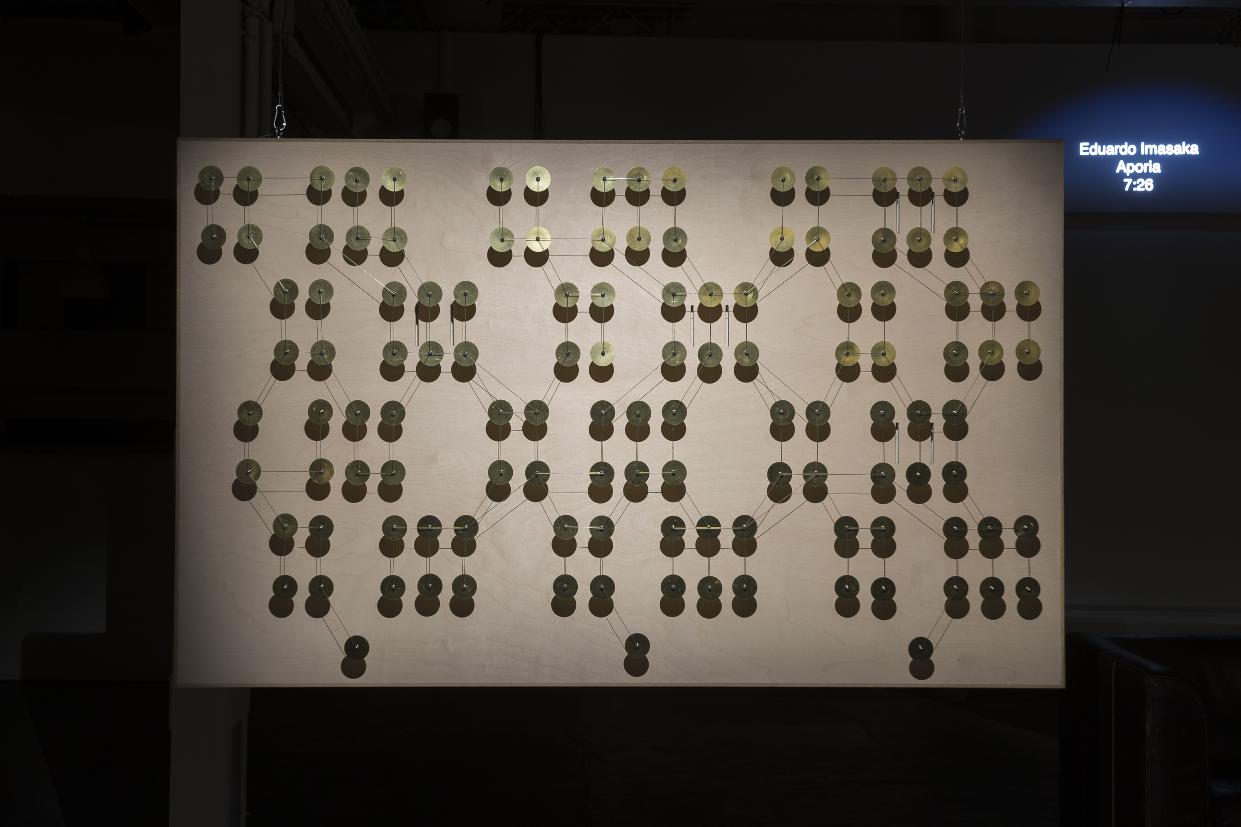 Multiverse of a Birdcage est un projet d’Alexandre Joly, qui a réalisé les panneaux haut-parleurs, et Daniel Zea, qui a conçu l’interface de diffusion sonore. L’installation est composée de 17 panneaux haut-parleurs suspendus dans l’espace, formant un système de diffusion à 17 voix. Cet acousmonium hybride contient environ 1’500 piezos, ces petites pastilles qui vibrent lorsqu’elles reçoivent un signal. Fixées à l’aide d’aimants sur des tiges en acier et reliées entre elles par des fils de cuivre et des cordes à piano, ces connexions apparentes dessinent des compositions graphiques et rappellent l’imagerie d’une lutherie expérimentale. Ces instruments de diffusion colorent les sons avec de subtiles réverbérations qui se révèlent à travers leurs mouvements dans l’espace. À la manière d’un salon d’écoute, Multiverse of a Birdcage invite à l’exploration de multiples univers sonores. Cet instrument collectif diffuse un répertoire de pièces sonores (actuellement 41) qui s’enrichit à chacune de ses présentations.