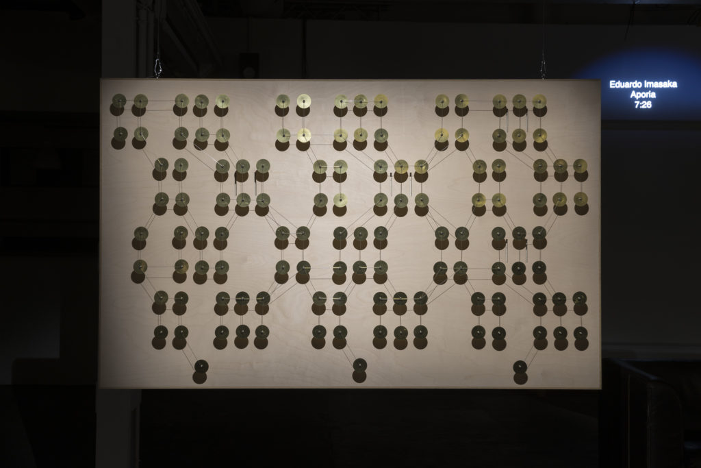 2020–2025, installation électro-acoustique (piezos, cordes de piano, fils de cuivre et panneaux de bois) avec diffusion d’oeuvres sonores de 41 artistes
